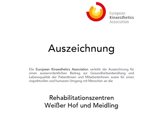 Gratulation zur Verleihung des Kinästhetik-GütesiegelDie European Kinaesthetics Association verleiht Juni 2025 die Kinaesthetics-Auszeichnung den Rehabilitationszentren Weißer Hof und Meidling. Beide Zentren zeichnen sich durch einen außerordentlichen Beitrag zur Gesundheitsentwicklung und Lebensqualität ihrer PatientInnen und Mitarbeitenden aus.