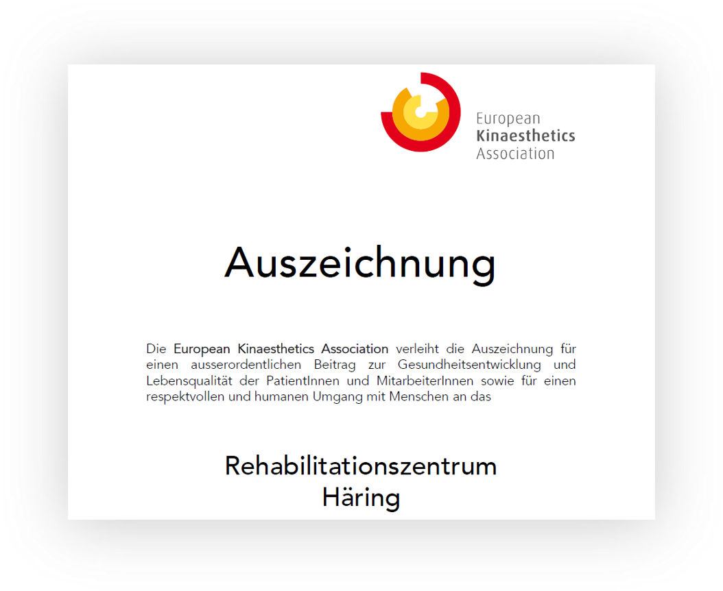 Gratulation zur Verleihung der Kinaesthetics Auszeichnung der EKADas Rehabilitationszentrum Häring in Tirol bekommt am 08.10.2025 als Vierte der AUVA-Rehabilitationseinrichtungen, die Kinaesthetics-Auszeichnung der European Kinaesthetics Association verliehen. Ausgezeichnet ist es für einen außerordentlichen Beitrag zur Gesundheitsentwicklung und Lebensqualität ihrer PatientInnen und Mitarbeitenden. Die Einschätzung erfolgte mit dem wissenschaftlichen validierten koQES-K in einem Assessment April 2025.